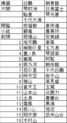 その他、今回全く影の薄かった力士たちについて。琴欧洲は前述のようにまあ頑張った。二桁取ったし、白鵬を唯一あわてさせた。あとは旭天鵬、時天空辺りの取りこぼしとしか言えない負け方を無くせば優勝争いに絡めるだろう。負けるときは立ち合いが異常に不用意である。先場所も十勝していて、安定感は出てきたかもしれない。日馬富士も序盤は不安だったが、終わってみると彼らしい立ち合いが多かったと思う。しっかりと前まわしをとってから力を入れて欲しい。あわてると自分から飛び出してしまい負けやすい。魁皇は勝ち越しが決まったあとの相撲振りがあまりにも無気力すぎて怒りを覚えた。琴光喜はもはやどうでもいい。朝青龍に勝ったのは奇跡で本来なら負け越していたし大関も陥落していた。千代……大…海……?そんな大関いましたっけ?