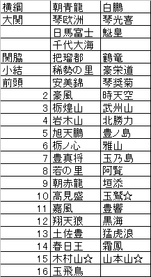 というわけで、さっさと個別評のほうに移ることにする。朝青龍については上述の通りだが、張り差しの威力の衰えは隠せるものでなく、速攻が決まらないパターンが増えている。本人も自覚しているのか、立会いが汚かったり、変化に近いことをやってしまったりしており、今場所については特にとても横綱と呼べる相撲ではなかった。別に私は彼の勝利至上主義を否定しているわけではないし、彼らしい相撲をとってくれればそれでいいとは思うが、見苦しくなるくらいなら自重はしてほしい。横審(笑)のくだらないお小言は無視しても、そこら辺のわきまえはできる男だと思っていたのだが。
